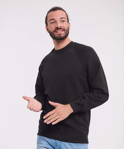Twin needle coverseams on neck, raglan sleeve, cuffs and waistband for extra durability. Herringbone back neck tape. Spotshield™ stain resistant coating for fabric protection. fade resistant.