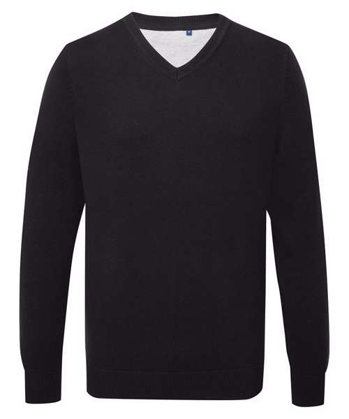 A great everyday sweater for men. The popular v-neck style allows for a shirt and tie to be visible underneath or can be worn without for a casual look. A patch on the underside reverse neck gives a stylish contrast effect. Decorative tuck stitching, ribbed knit on the neckline, cuffs and hem make for a classic and comfortable pullover for men.