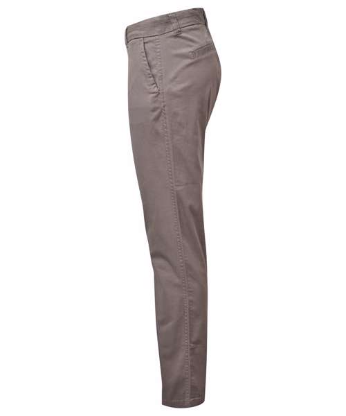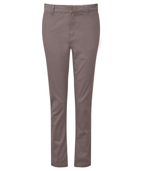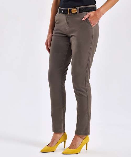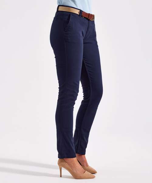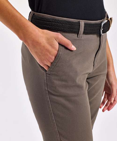 Women's classic fit chinos in a soft fabric finish. Zip fly with button fastening at waist. Belt loops. Two swing pockets to the side and two non-functional back jetted pockets for styling. Product contains no branded neck label. Removable Kimble or looped garment tags. Inner seam label holds important product information on one label with a second label containing brand information which can be cut-away. Please note old stock may contain a fixed branded label.