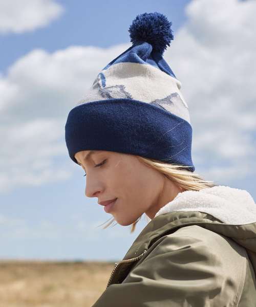 Contains 100% certified recycled polyester. Bold mountainscape design. Double-layer knit. One-tone pom pom. Cuffed design for optimal decoration. TearAway label for ease of rebranding.