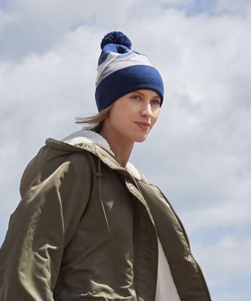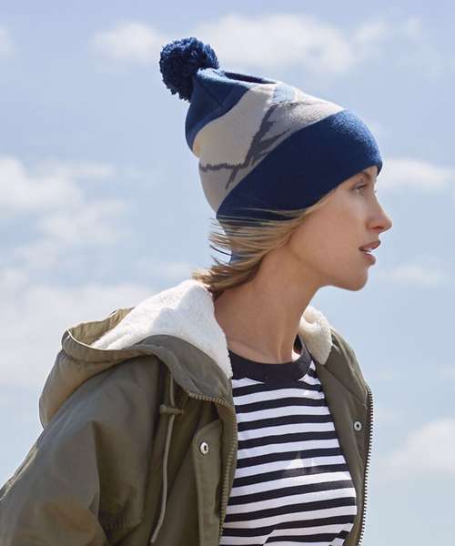 Whether you’re in mountainous high altitudes or back at ground level in the great outdoors, stay warm and protected in bold style. With its mountainscape-inspired colourways, this beanie provides the perfect finishing touch to any outdoorsy ensemble, complete with a fun uni-tone pom pom – and, containing 100% recycled polyester.
