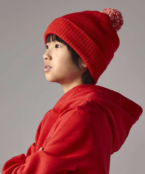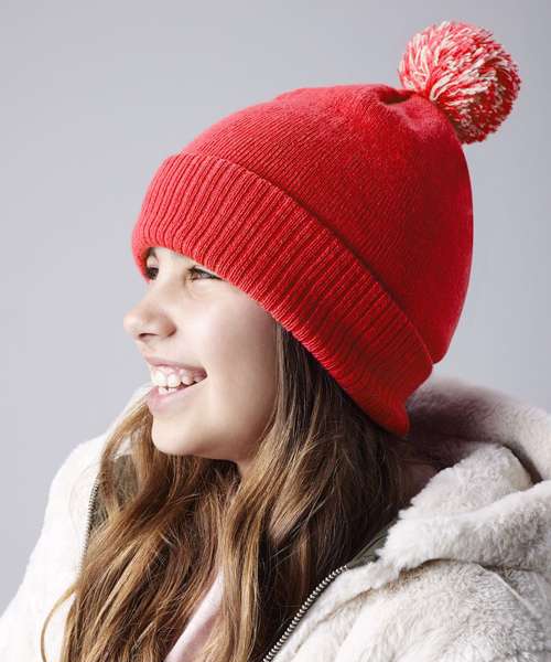 - Dual style cuffed or slouchTwo-tone pom pomDouble-layer knit