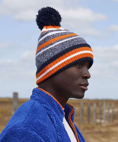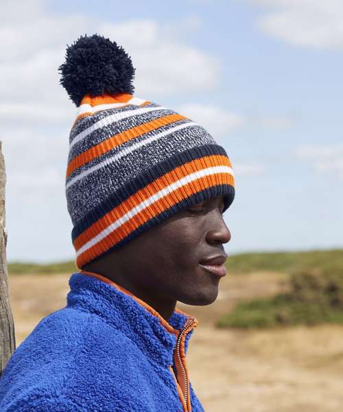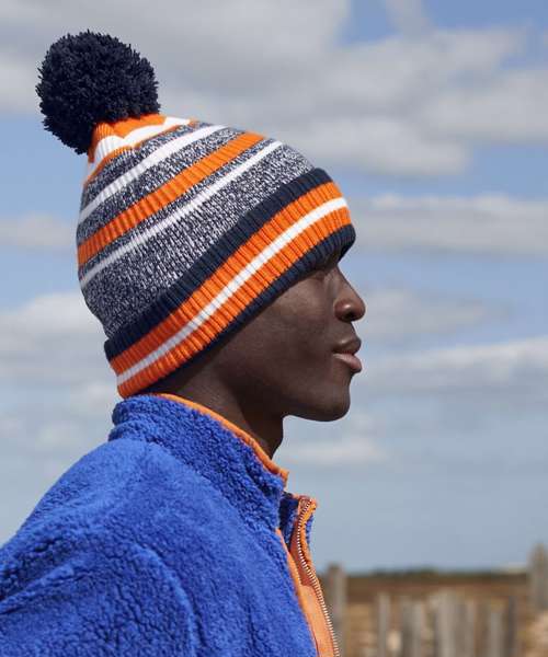 Contains 100% certified recycled material. Sport colour combinations. Oversized fold over cuff. Multi stripe design. Double layer knit. Self-coloured pom pom. Microfleece lining for comfort and warmth. Cuffed design for optimal decoration. TearAway label for ease of rebranding.