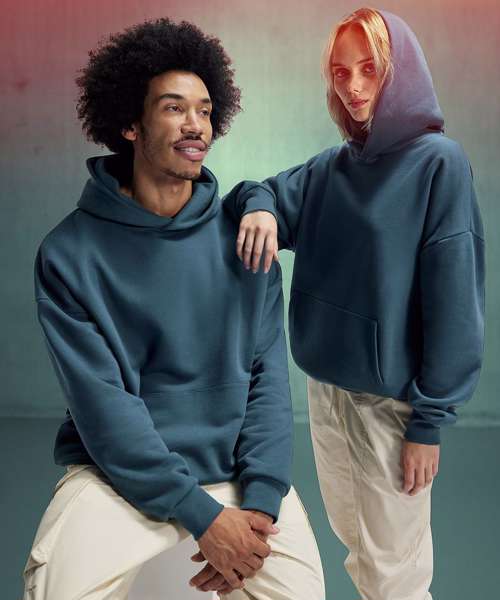 True unisex style with side seams. Durable 350gsm fabric with a sturdy, substantial hand feel. B&C PST (Perfect Sweat Technology). Low Shrinkage Fleece (LSF). 100% cotton face for perfect printability. Luxurious hand feel. Dropped shoulder and oversized feel for a relaxed fit. Self-fabric lined darted hood without drawcords for an urban, minimalist look. High-quality cuffs and bottom hem in 1x1 rib. Kangaroo pocket thoughtfully crafted for comfortable hand placement and secure storage. Curated colour palette to serve POD, influencer and music merch, fashion and retail/e-tail, workwear and academic segments. ‘B&C No Label’ solution for easy rebranding. Contains recycled polyester.