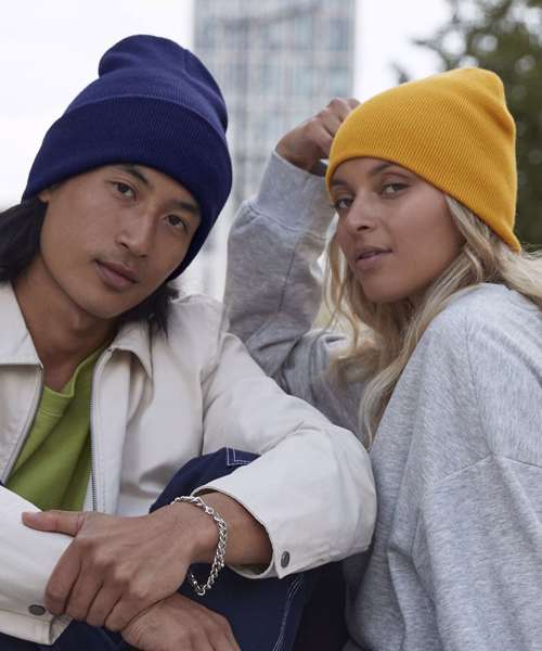 Colours Ash and Granite: 51% Polyester, 49% Acrylic. Other colours: 50% Polyester, 50% Acrylic. Contains 100% certified recycled polyester. Contains at least 50% recycled polyester. Recycled polyester made from 100% rPET. Double-layer knit. Wide-cuffed design for optimal decoration. TearAway label for easy rebranding.