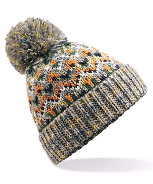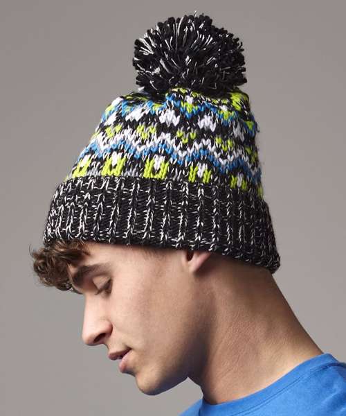 TearAway label for ease of rebranding. Cuffed design for optimal decoration. Self-coloured pom pom. Contemporary geometric pattern.