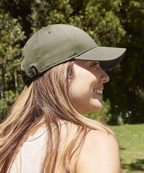 Contains 100% certified, organically grown cotton. 6-panel design. Structured front panels. Stitched ventilation eyelets. Self-fabric strap with gunmetal buckle. TearAway label for ease of rebranding.