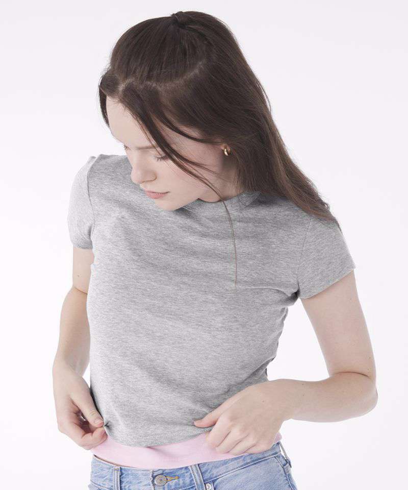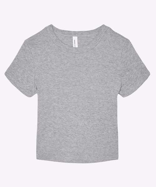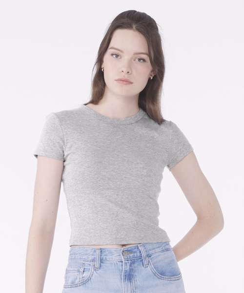 Crew neck binding. Mid-length. 1x1 micro rib. Fitted. Stretch fit. Set-in cap sleeves. Pre-shrunk. Side-seamed.