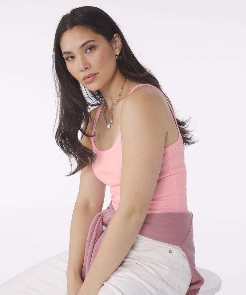 Thick spaghetti straps. Mid-length. 1x1 micro rib. Fitted. Stretch fit. Pre-shrunk. Side-seamed.