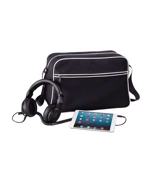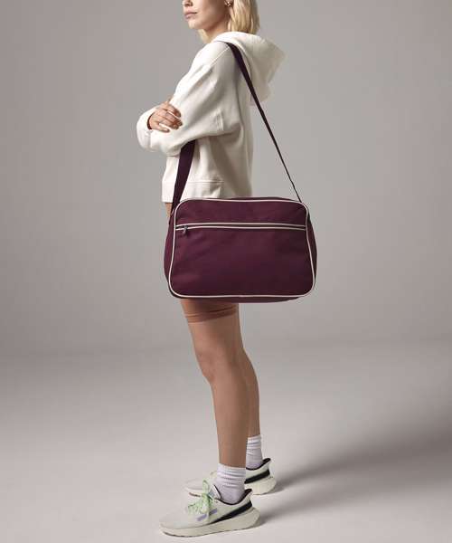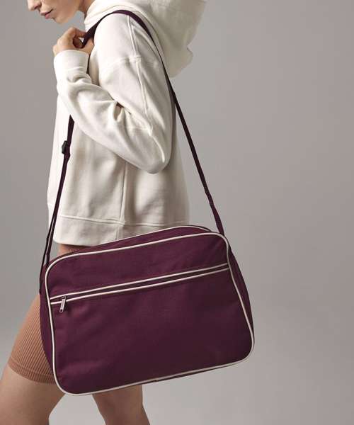 Retro styling. Adjustable shoulder strap. Zippered front pocket. Internal valuables pocket. Internal baseboard.