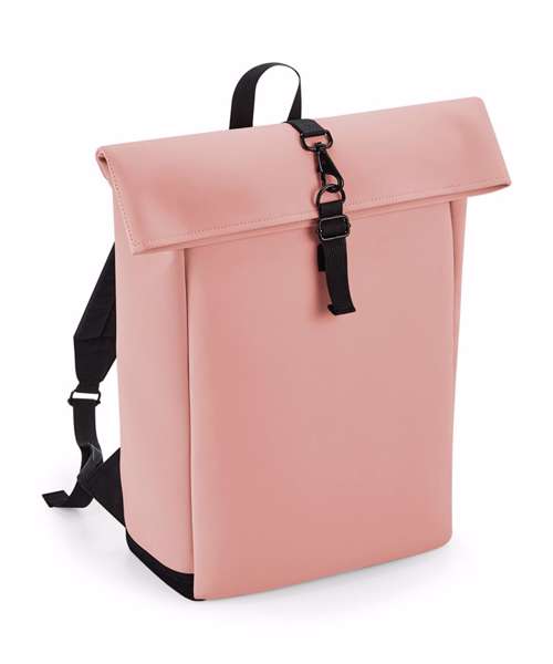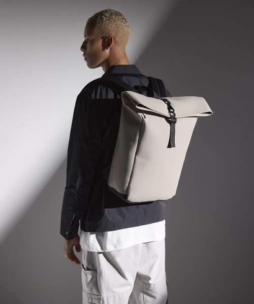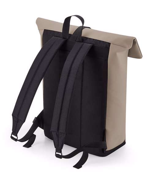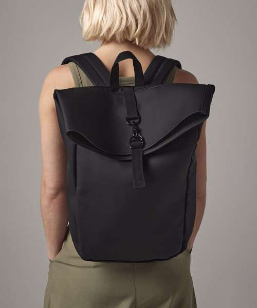 100% Recycled polyester with matte-look PU coating. PVC-free. Water-repellent fabric. Padded internal laptop sleeve, compatible up to 15.6". Minimalist styling. Zipped front pocket. Double-layer base panel for durability. Roll-top closure. Secure clip closure. Padded adjustable shoulder straps. Grab handle. TearAway label for easy rebranding.