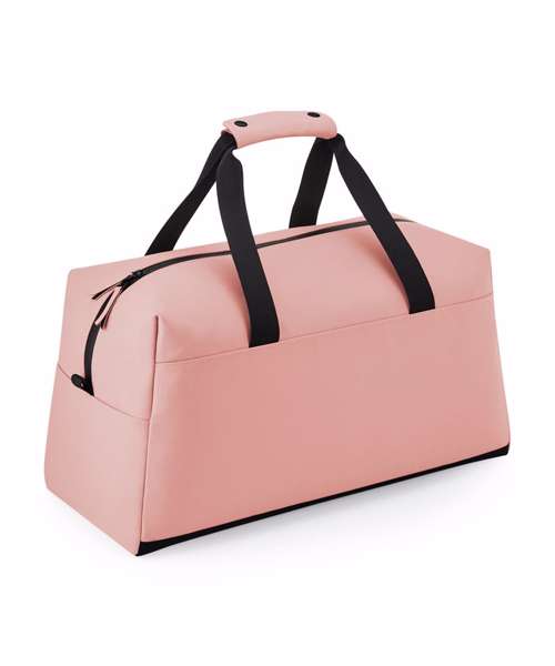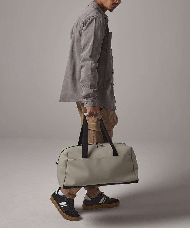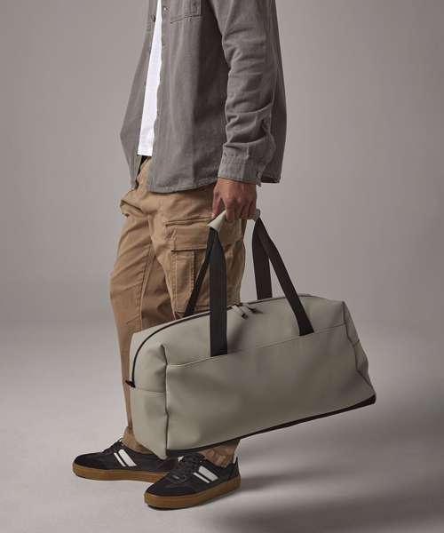 100% Recycled polyester with matte-look PU coating. PVC-free. Water-repellent fabric. Minimalist styling. Extra-long main compartment zip for easy access. Zipped internal valuables pocket. Double-layer base panel for durability. Self-fabric handle wrap. Webbing carry handles. Can be carried by hand or over the shoulder. TearAway label for easy rebranding.