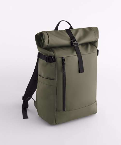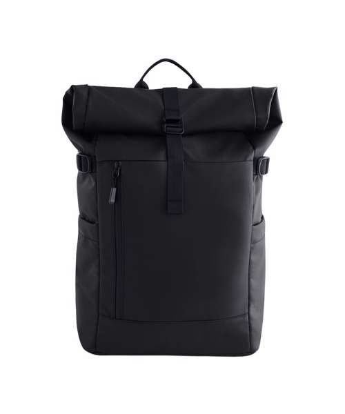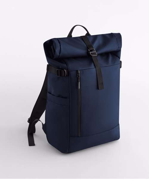 Contains 100% recycled 900D polyester with PU coating. Padded laptop compartment compatible up to 16". Separate padded iPad/tablet pocket. External zipped laptop pocket. Elasticated side pockets. Padded air mesh back panel. Padded base. Water-resistant zip closures. Secure roll-top with metal hook closure. Compression straps. Padded adjustable shoulder straps. Grab handle. Adjustable chest strap. TearAway label for ease of rebranding. Global Recycled Standard (GRS-certified, CU811033).