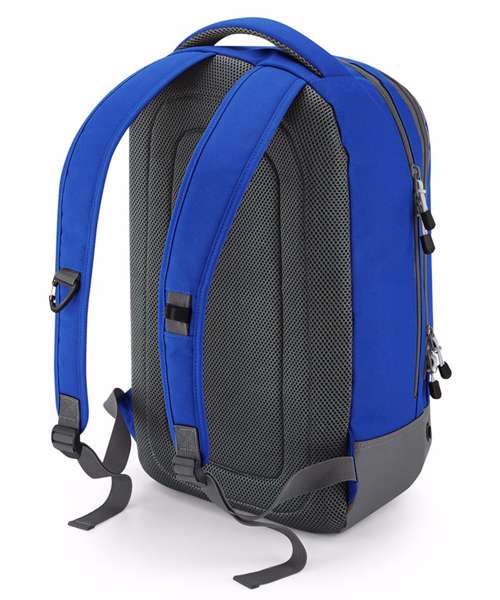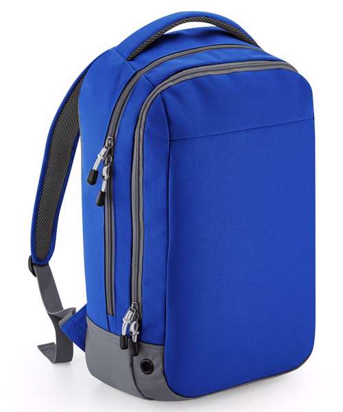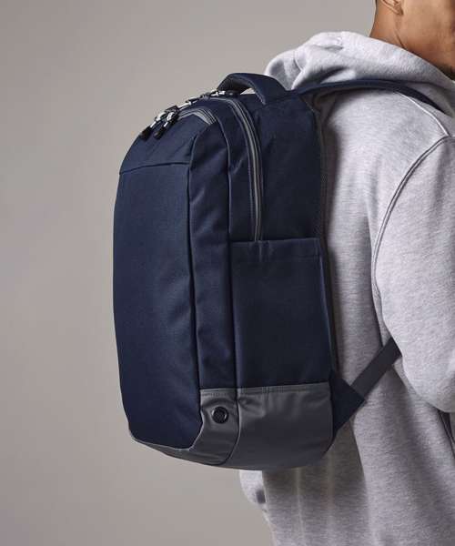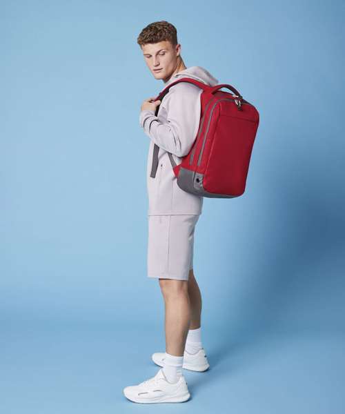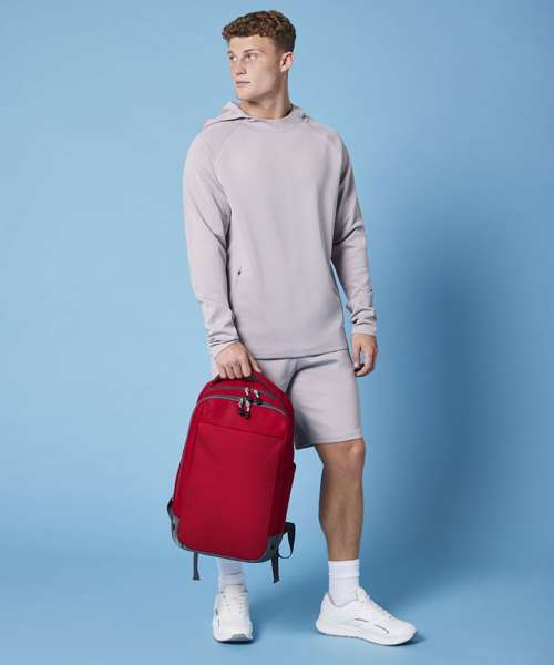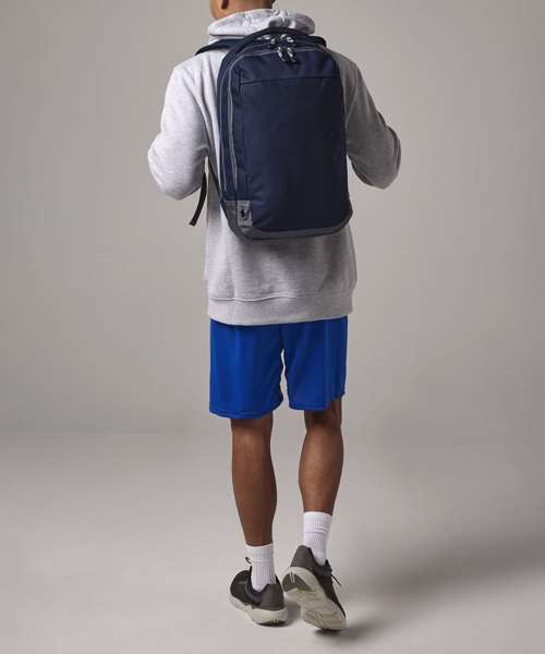 Water-resistant fabric. Wide zip opening for easy access. Front pocket organiser section. Internal slip pocket. External bottle pocket. Secure wireless headphone holder. Easy-access attachment clip. Metal ventilation eyelets. Breathable padded mesh back panel. Ergonomically designed straps for everyday comfort. Padded grab handle. TearAway label for ease of rebranding.