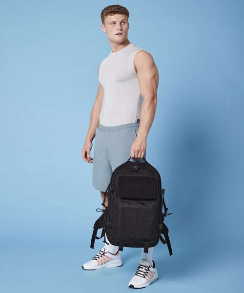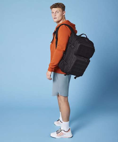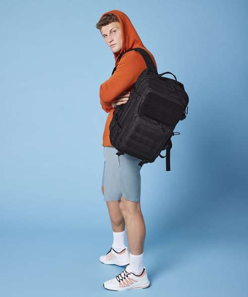 Military-inspired design. MOLLE webbing loop detail. Large main compartment. Padded laptop compartment, compatible up to 17". Full Rip-Strip™ front pocket for optimal decoration. Three large zipped front pockets. Dual tight-knit stretch mesh bottle pockets, capable of holding 750ml bottle shakers. Internal mesh pockets. Padded back panel. Large top carry handle. Compression straps. Ergonomically designed straps for everyday comfort. Fully adjustable chest strap. Compatible with Rip-Strip™ patches BG840 and BG841. Compatible with Modulr™ multi pockets BG241 and BG242. TearAway label for ease of rebranding.