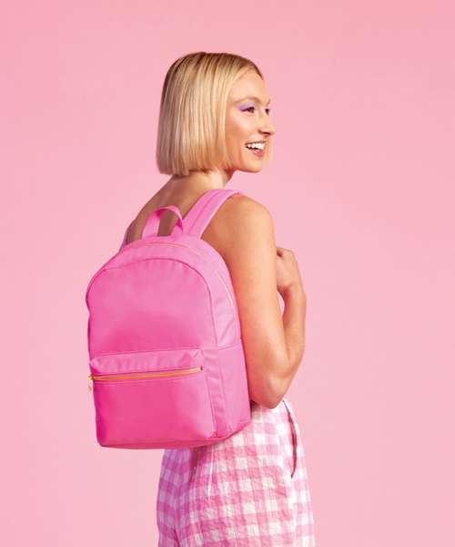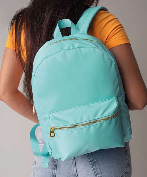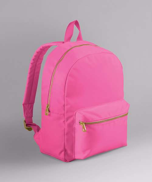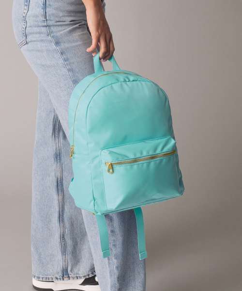 Premium fabric and finish. Bright colour pop palette. Zipped main compartment. Zipped front pocket. Padded back panel. Brushed gold metal zip and pulls. Padded adjustable shoulder straps. Grab handle. TearAway label for ease of rebranding. Contains recycled polyester.