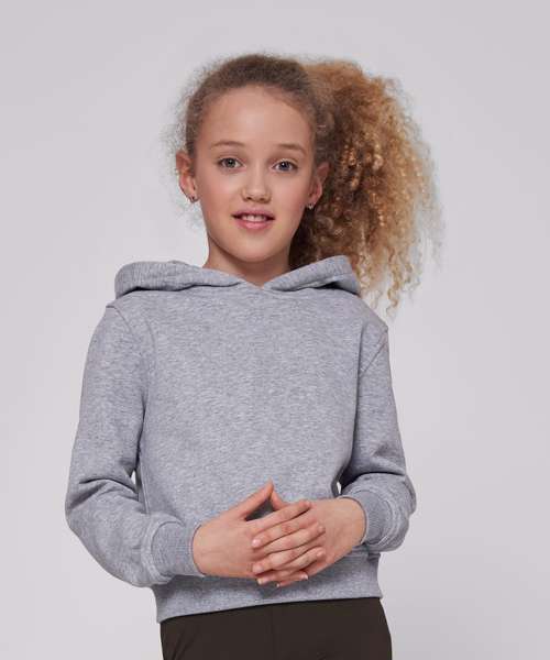 Ideal for cosy hour, the girls cropped sweat hoodie convinces with its balance of typical hoodie details and trendy cropped cut. A hood makes it a comfortable must-have. Wide ribbed cuffs on the sleeves and hem make the perfect look, which can be personalised with prints of your choice. This item is manufactured in a FAMA Certified factory. FAMA stands for Facility and Merchandise Authorisation and is a high standard production certificate.