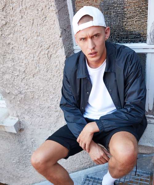 This sporty coach jacket pleases with a simple and functional design, which can be further enhanced through stitching, silk screening or flock printing. Its raglan cut with seamless shoulders in combination with the continuous press-button facing as well as the elastic cuffs turn this nice piece of garment into a real street wear style jacket. You will also get some handy side pockets and an elastic waistband with drawstring and stoppers at your disposal. The sophisticated design is rounded off by a simple yet elegant collar. The functional and robust upper is made of nylon, the lining out of cotton and taffeta.