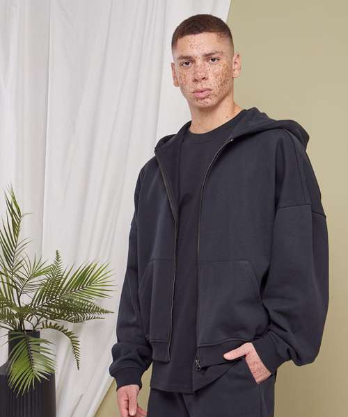 Presenting an oversized fit with heavily dropped shoulders, an extra-large hood and a divided kangaroo pocket, this men’s zip hoodie is a homage to the vibe of the 90s. The style is completed by wide rib cuffs on the sleeves and hem. Made from heavy cotton terry, it can further be refined with screen or flex printing. amfori BSCI and SEDEX certified.