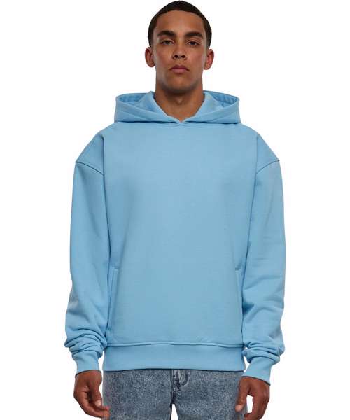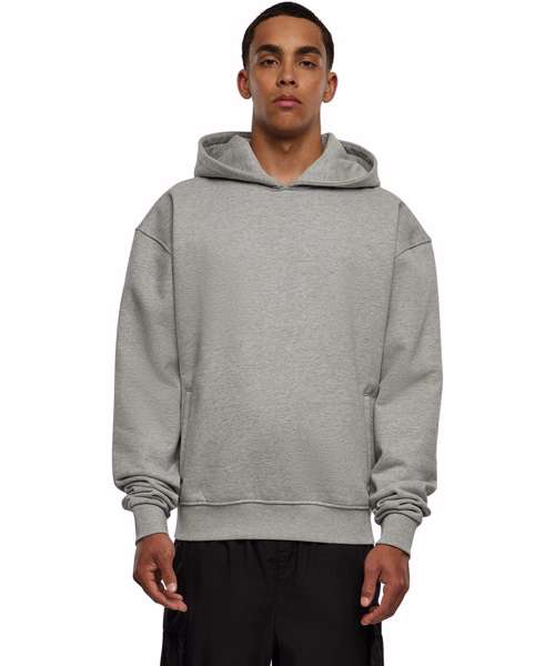 The men's hoodie features a large hood and wide rib cuffs on the sleeves and hem. The integrated kangaroo pockets add a practical touch. A casual urban fit with dropped shoulders creates a masculine silhouette. The men's hoody is made of smooth and heavy brushed fleece, which can be further refined using flex or screen printing.
