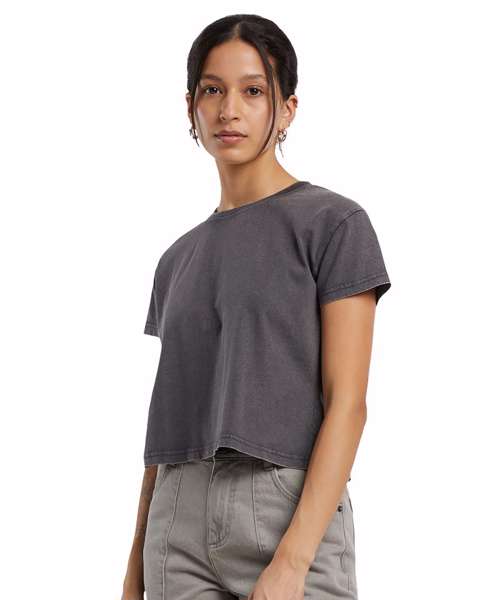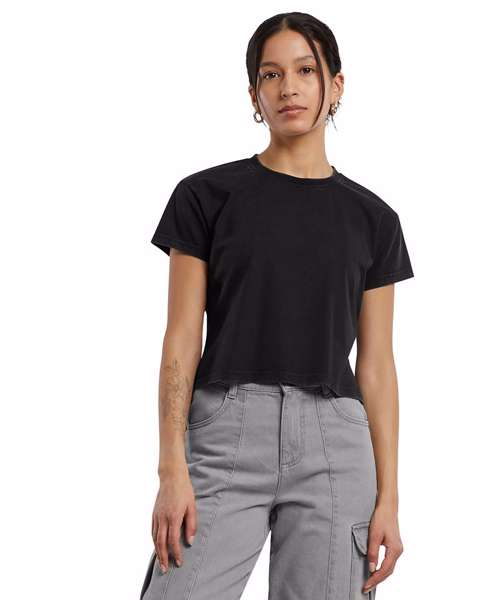 Stylish crop for a vintage vibe. Simple design with a classic round neck. Regular fit offers comfortable wear. Short sleeves for a casual look. Timeless appeal with clean, plain pattern.