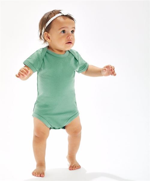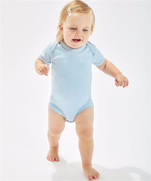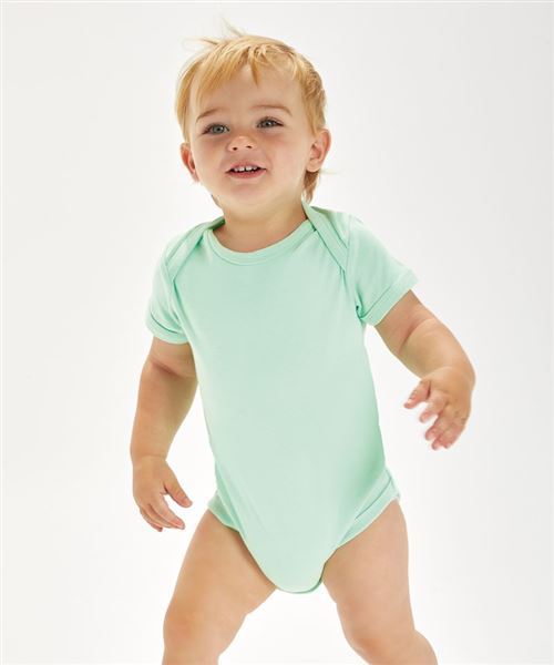 Super soft baby bodysuit with envelope style neckline, binding at edges for shape retention and nickel-free poppers at legs for ease of dressing