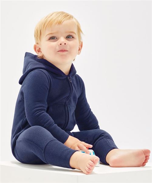 Soft and cosy baby all-in-one with brushed inside and 3/4 length zip for ease of dressing. Extra long cuffs can be worn folded down or back as baby grows. Seam free back for optimal decoration potential.