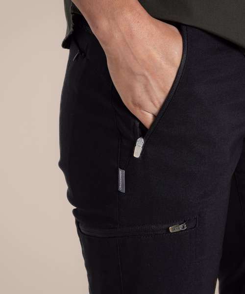 Stretch trousers with water-resistant finish, featuring 4 pockets. Stretch recycled polyamide elastane with EcoShield DWR finish. 100% recycled zip tapes. UPF 40+ sun protection and SolarShield technology. EN1378-2.