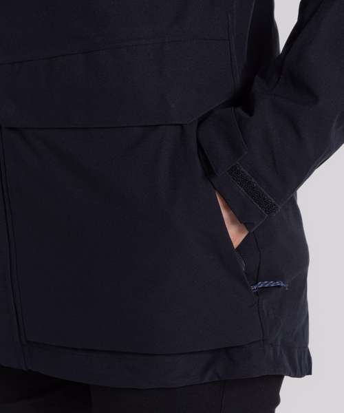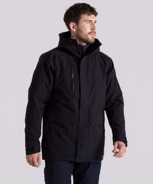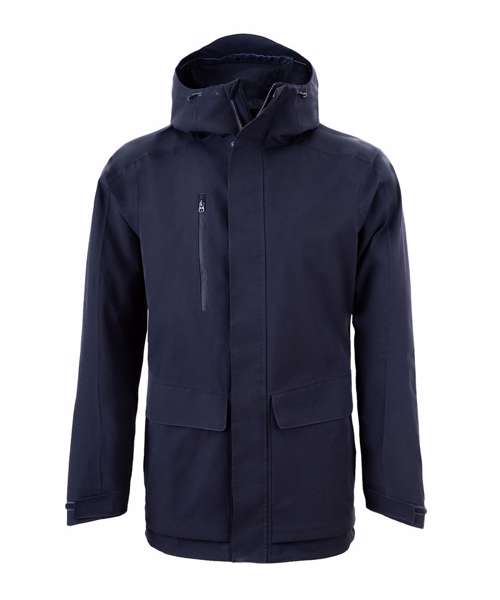 3-in-1 jacket. Waterproof and breathable shell outer with a softshell inner jacket. 10,000mm waterproof and 20,000g/ m2/ 24hrs breathable. Recycled polyester stretch mesh and recycled polyester taffeta lining outer. Recycled polyester elastane softshell with EcoShield DWR finish and striped microfleece back inner.