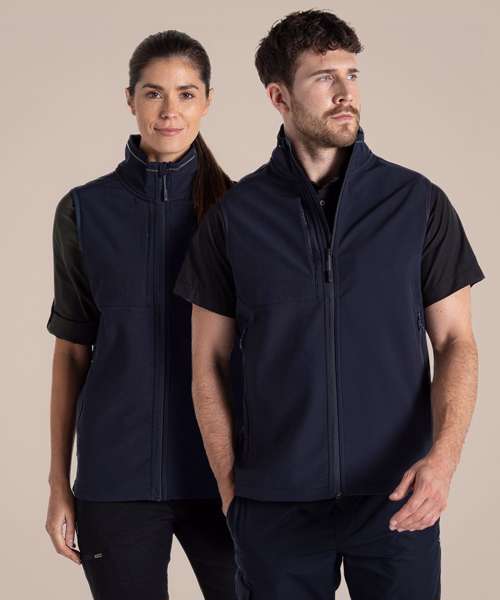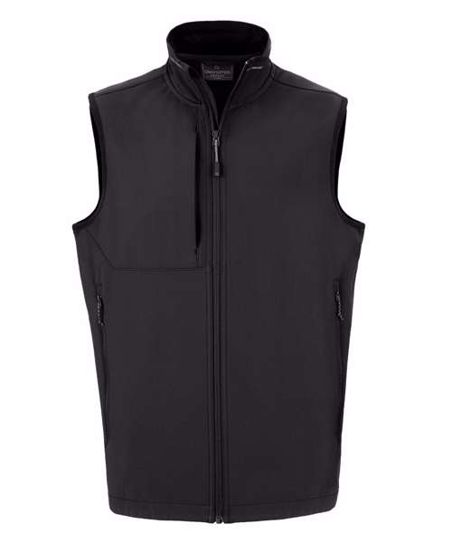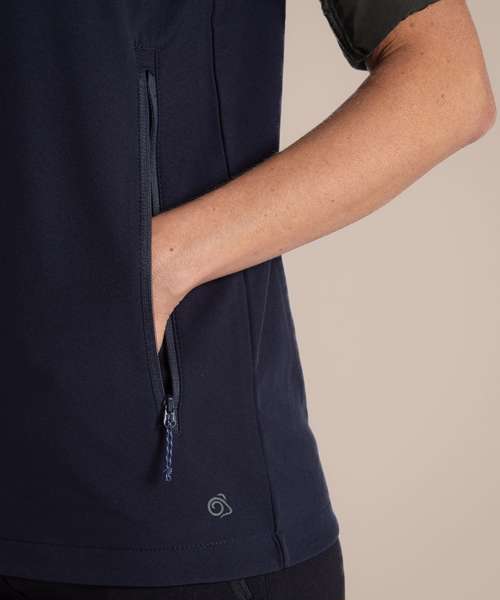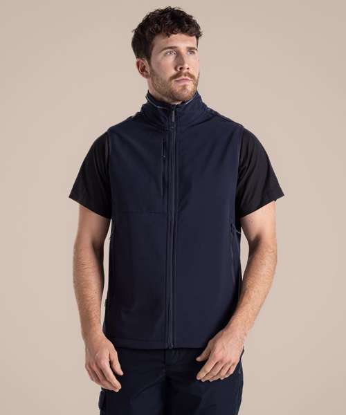 Water-resistant and windproof softshell vest with 3 pockets. Recycled polyester elastane softshell with EcoShield DWR finish. Striped microfleece back and recycled zip tapes.