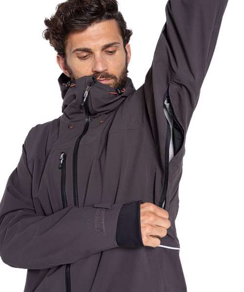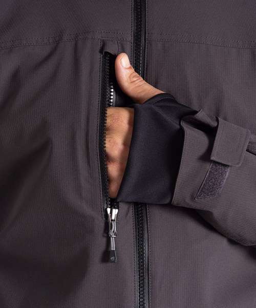 EN343-3.3 AquaDry membrane recycled polyester stretch ripstop with H2OShield DWR, polyester elastane stretch mesh and recycled polyester taffeta lining. Recycled zip tape to all zips except centre front and chest pocket zips. GRS certified fabrics, ETI factories, REACH compliant.