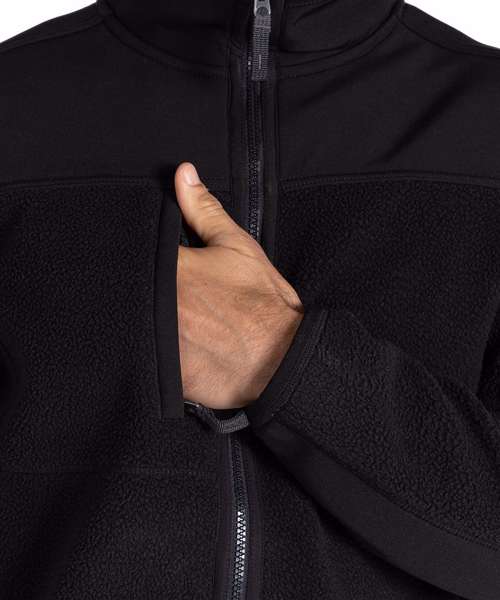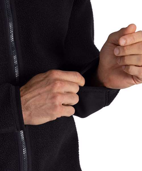 Recycled borg fleece with part-recycled polyester elastane and H2OShield DWR finish to upper body and lower back sleeve panels. Recycled zip tapes. GRS certified fabrics, ETI factories, REACH compliant.