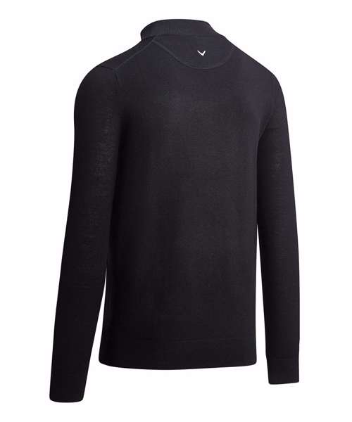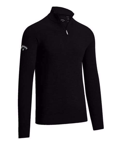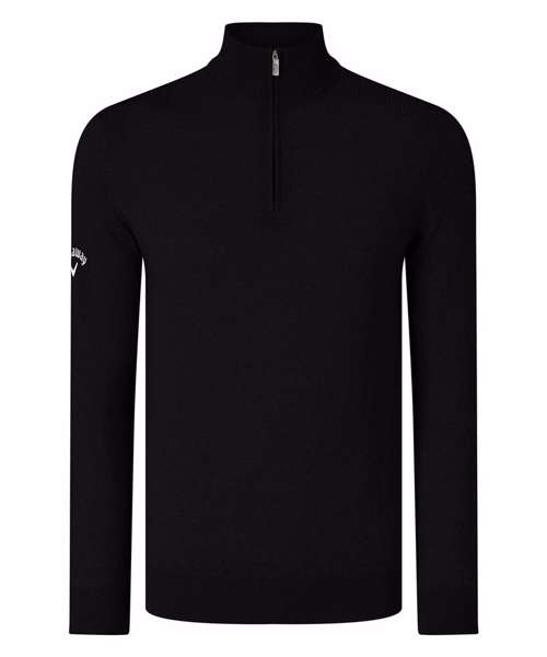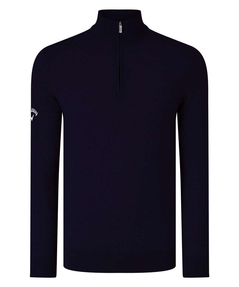Ribbed shoulder ¼ contrast zip Merino sweater. Contrast or tonal embroidered Callaway Tour logo on the wearer's right sleeve and Chevron on the back neck. Oeko-Tex certified. Reach certified. WRAP certified.