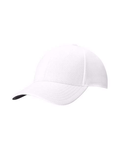 Men's front crested cap. 100% polyester in hex fabric design. Performance fabric. 30+ UV protection. Small chev rubber tab on an adjustable back fastening. Moisture-wicking sweatband.