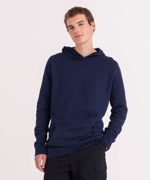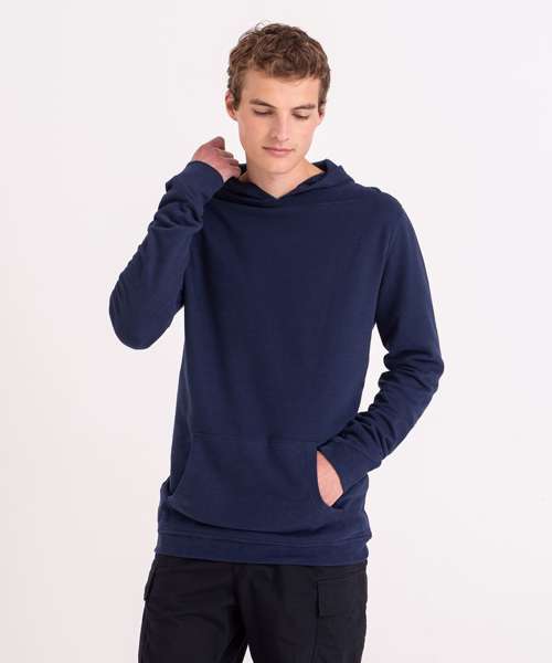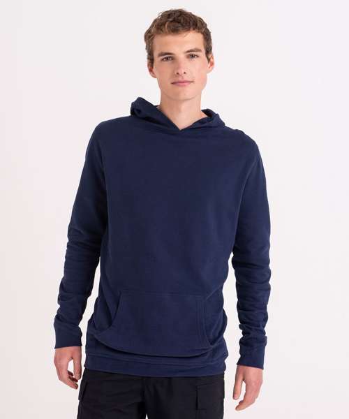 100% Organic hoody, with brushed inner and peached face. Kangaroo pocket, angled cuff detail and no drawcords for sleek look.