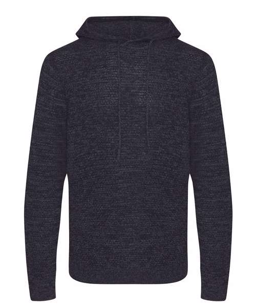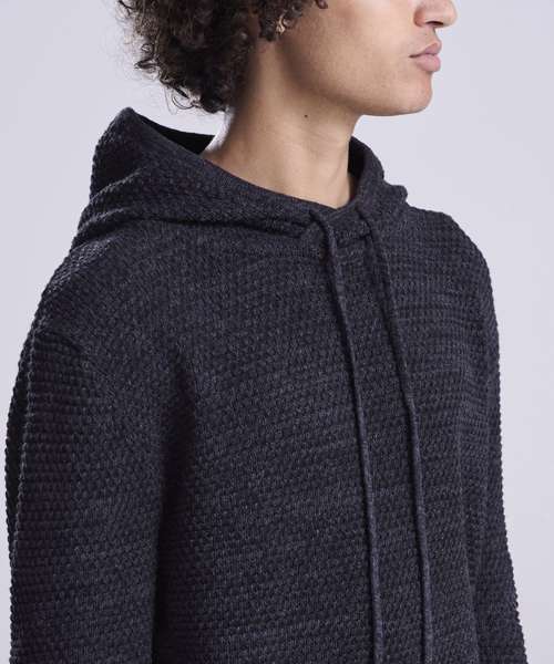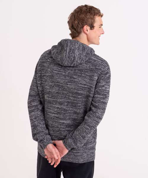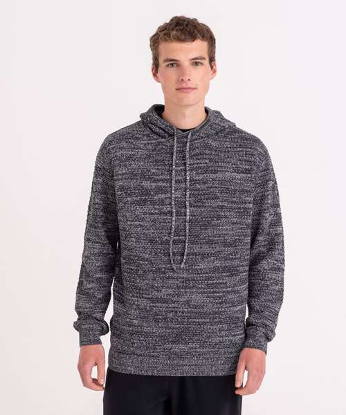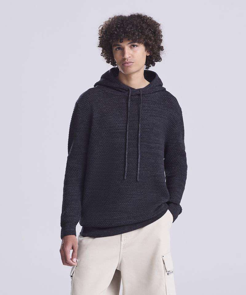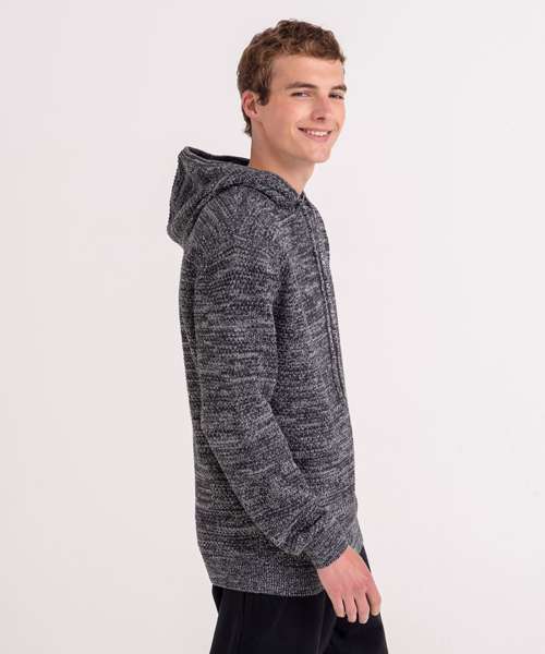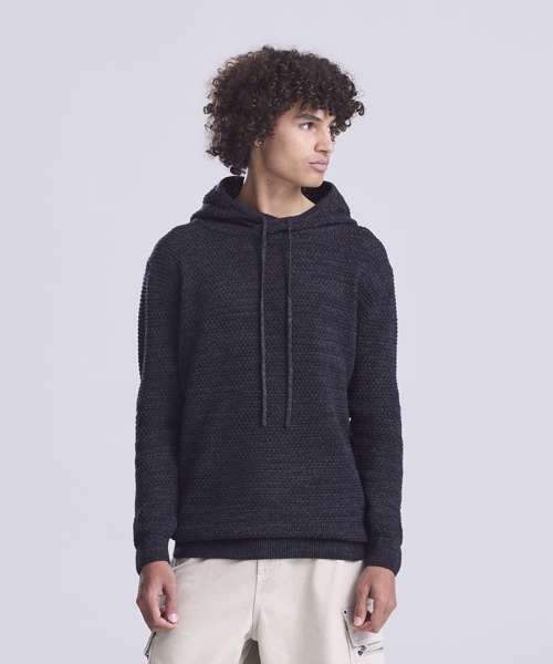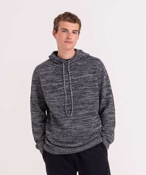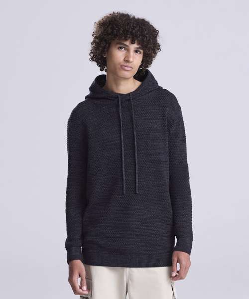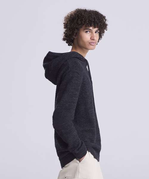 Chunky tuck stitch knitted hoodie made from regenerated yarn. Featured hood with drawcords, rib at cuffs and hem and two-tone yarn.