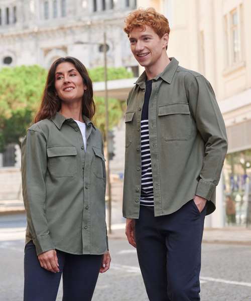 Heavyweight overshirt. Heavy garment wash. Back yoke. Twin-needle topstitching. Plastic horn-effect buttons. Mitred patch pockets with flap. Mitred cuff and placket with button fastening. Curved hem. Forward shoulder seam. Tag-free for easy rebranding.