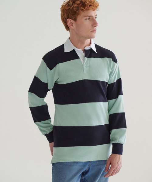 Sewn Stripe Rugby in heavy jersey. Traditional rugby collar with cotton webbing. Taped shoulders and side vents. Rubber buttons. Elastane re-inforced cuffs for shape retention. Twin-needle seams and hems. Rugby leisurewear garments are for leisure use only.