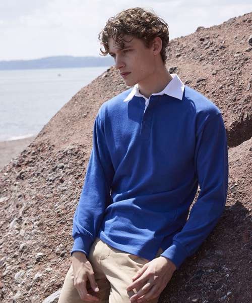 Self fabric taped side vents. Elastane reinforced cuffs for shape retention. Twin-needle hems. Traditional rugby collar with cotton webbing. Dyed to match plastic buttons. Rugby leisurewear garments are for leisure use only.