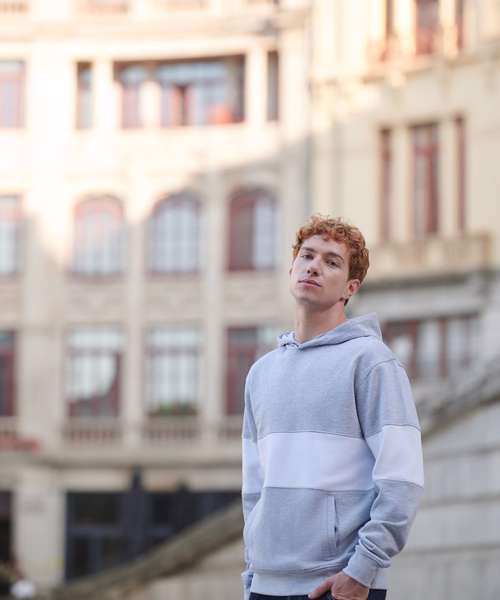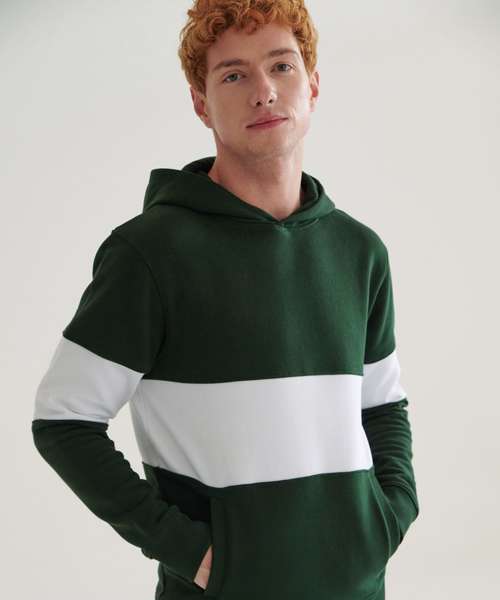 Slightly oversized fit. Heavyweight brushed back fleece. Made with recycled polyester. Panelled area across torso and sleeve in contrasting colour. Ribbed sleeve cuff and hem. Two side welt pockets with an inner kangaroo pocket. Two-piece hood. Single Jersey lining. Tag-free for easy rebranding.
