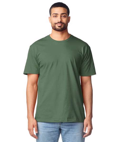 Seamless twin needle 3/4" collar. Taped neck and shoulders. Rolled forward shoulders for better fit. Twin needle sleeve and bottom hem. Quarter turned to eliminate centre crease. Eurofit - sleeker fit in shoulder and sleeve. High stitch density for smoother printing surface. Tearaway label.