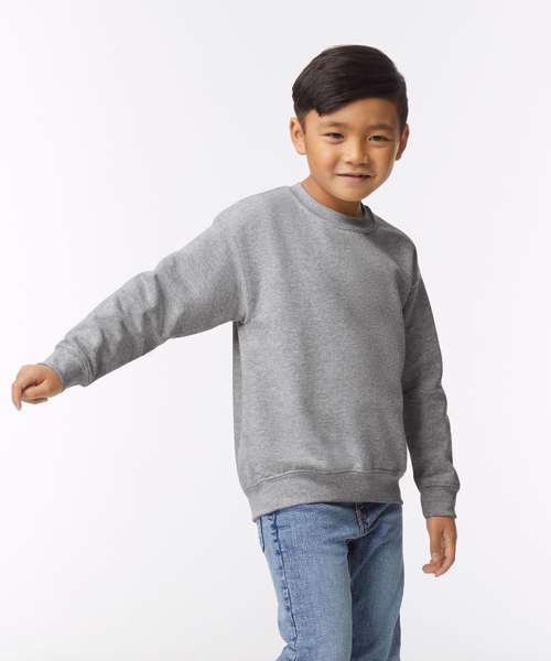 If they had their way, kids would live in sweats – especially the plush softness of this Gildan® Heavy Blend™ crewneck. It’s crafted of a lofty polyester and cotton blend using air jet yarns for a softer feel and reduced pilling. Details like sturdy reinforced shoulders and rib knit wrists and waist help this crewneck retain its shape through kids uproarious activity.