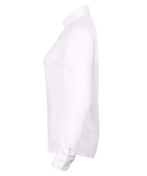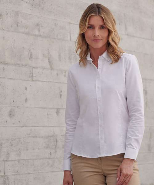 Women's modern fitted, button-down Oxford shirt. Cotton-rich lightweight Oxford with wrinkle resistant finish. Short point collar. Pearlised buttons. Adjustable cuff. Front and back darts for added shape.