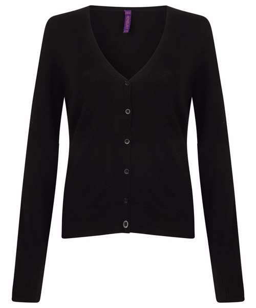 Fine knit 12 gauge short length cardigan. Semi-fashioned sleeve and neck detail. Self-coloured pearlised buttons. Set in sleeves. 1x1 neck rib, hem and cuffs. Co-ordinates with Men’s HB720, HB724, HB725 and Women's HB721. Henbury cut-out brand label.