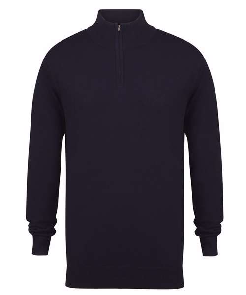Fine knit, 12 gauge in quarter zip jumper. Semi-fashioned sleeve with 1x1 quarter zip neck rib, hem and cuffs. Henbury cut-out brand label. Metal zip and puller.