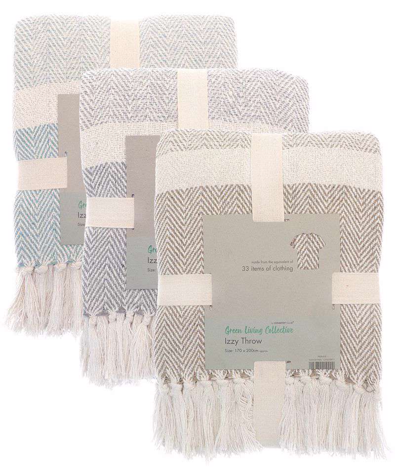 The Izzy herringbone-design throw is made from recycled fabrics (the equivalent of 33 items of clothing) and features tasselled edges. Throw it over a bed or sofa, or pack it to take to the beach or on a picnic. Machine-washable.