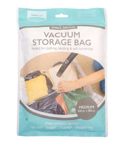 A vacuum bag perfect for storing clothes, bedding, curtains, throws and blankets. Helps protect against dirt, dust, damp and insects. Space-saving and reusable. Double-zip seal. Suitable for use with any vacuum cleaner with an extension hose attachment.