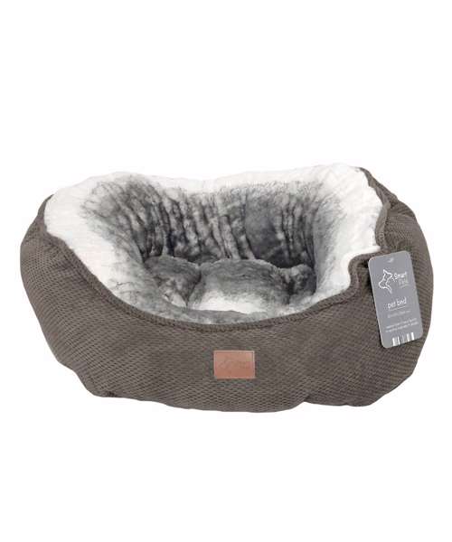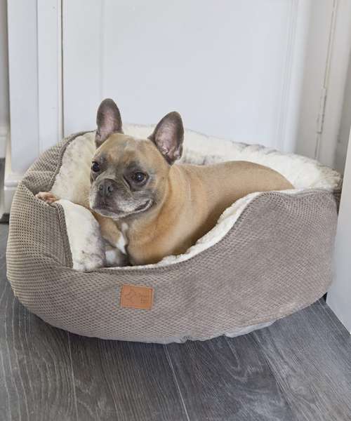 Memory foam luxury faux fur. Machine washable. Durable and stylish faux suede outer fabric combined with super-soft luxury faux fur inner and memory foam fill. Round shape with scooped front for easy access.