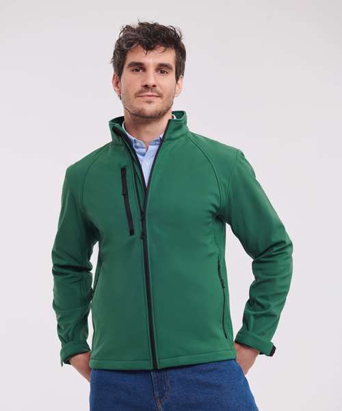 3 layer softshell fabric with breathable membrane and bonded microfleece lining, water resistant to 5000mm. Side pockets and chest pocket with inner lining, reversed zip and cord pulls. Full zip with inner storm flap and zip neck protector at collar. Bungee cord in hem. Adjustable cuffs. Drop tail. Large left chest side decoration access. Fully launderable at 40°C.
