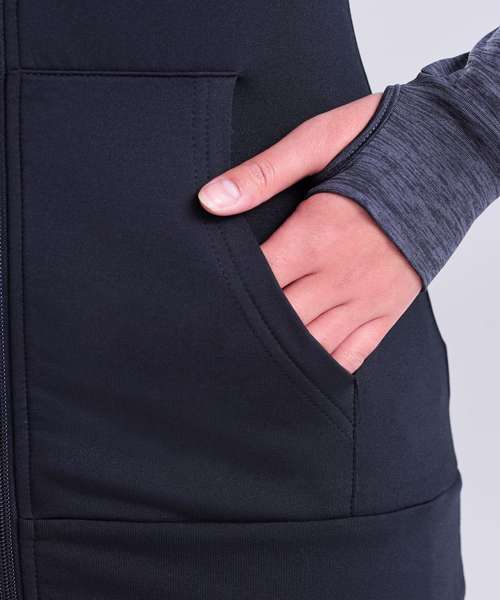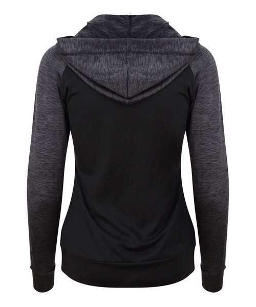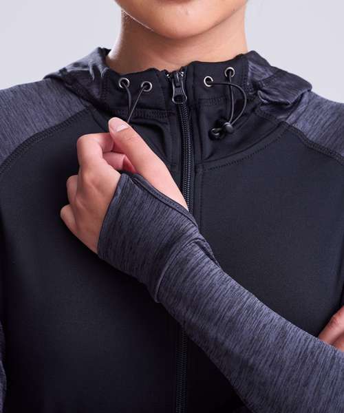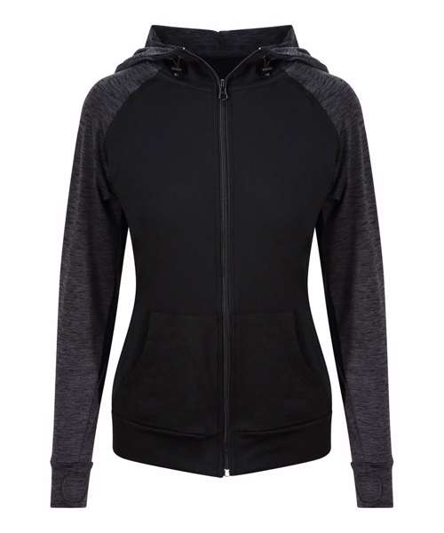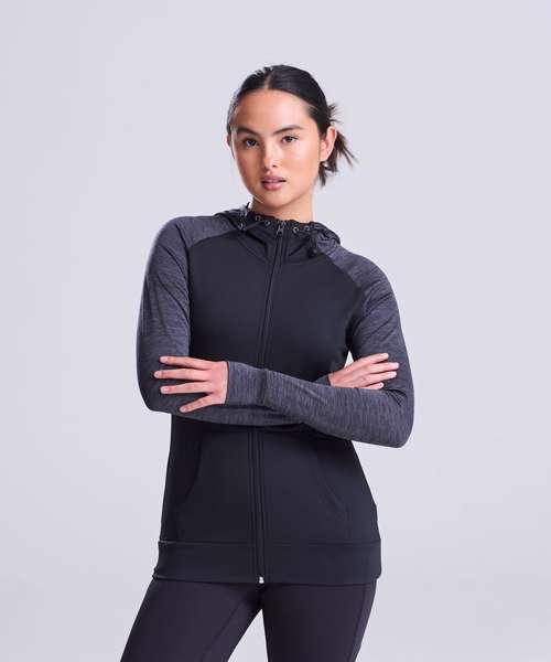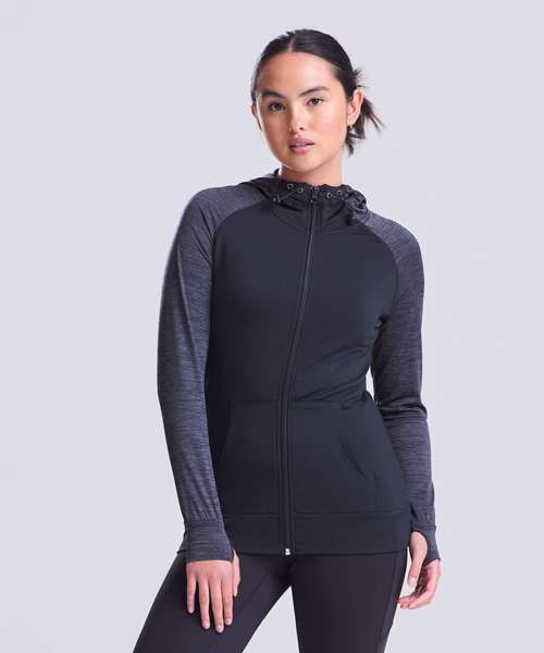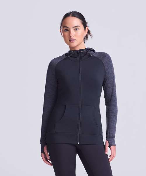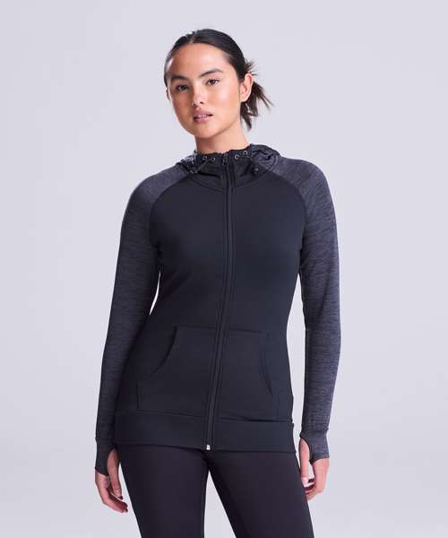 Feminine fit sports zoodie with adjustable drawcords hood, raglan sleeves with thumb holes and full-front zip. Contrast fabric on sleeves and body.